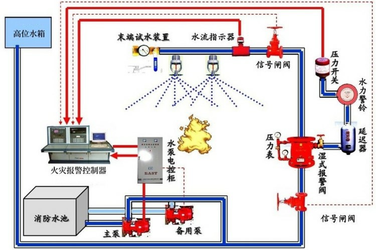 火灾发生时,在火场温度的作用下,闭式喷头的感温元件温升达到预定的动作温度范围时,喷头开启喷水灭火。水在管路中流动后,打开湿式阀瓣,水经过延时器后通向水力警铃的通道,水流中水力警铃发出声响报警信号,与此同时,水力警铃前的压力开关信号及装在配水管始端上的水流指示器信号传送至报警控制器控制室,经判断确认火警后启动消防水泵向管网加压供水.达到持续自动喷水灭火的目的。